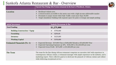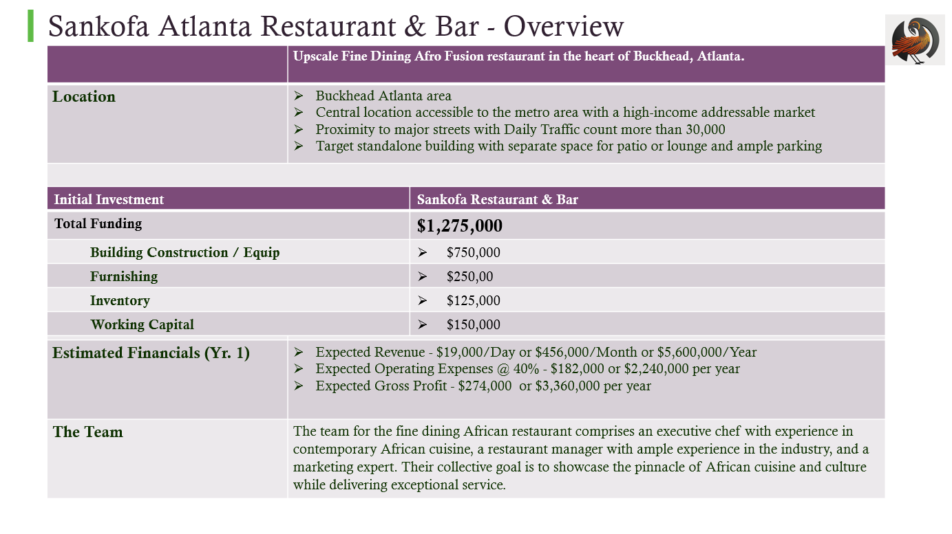 A total of $1,275,000 capital injection is needed to create an unmatched dining experience that celebrates the rich diversity of African cultures
